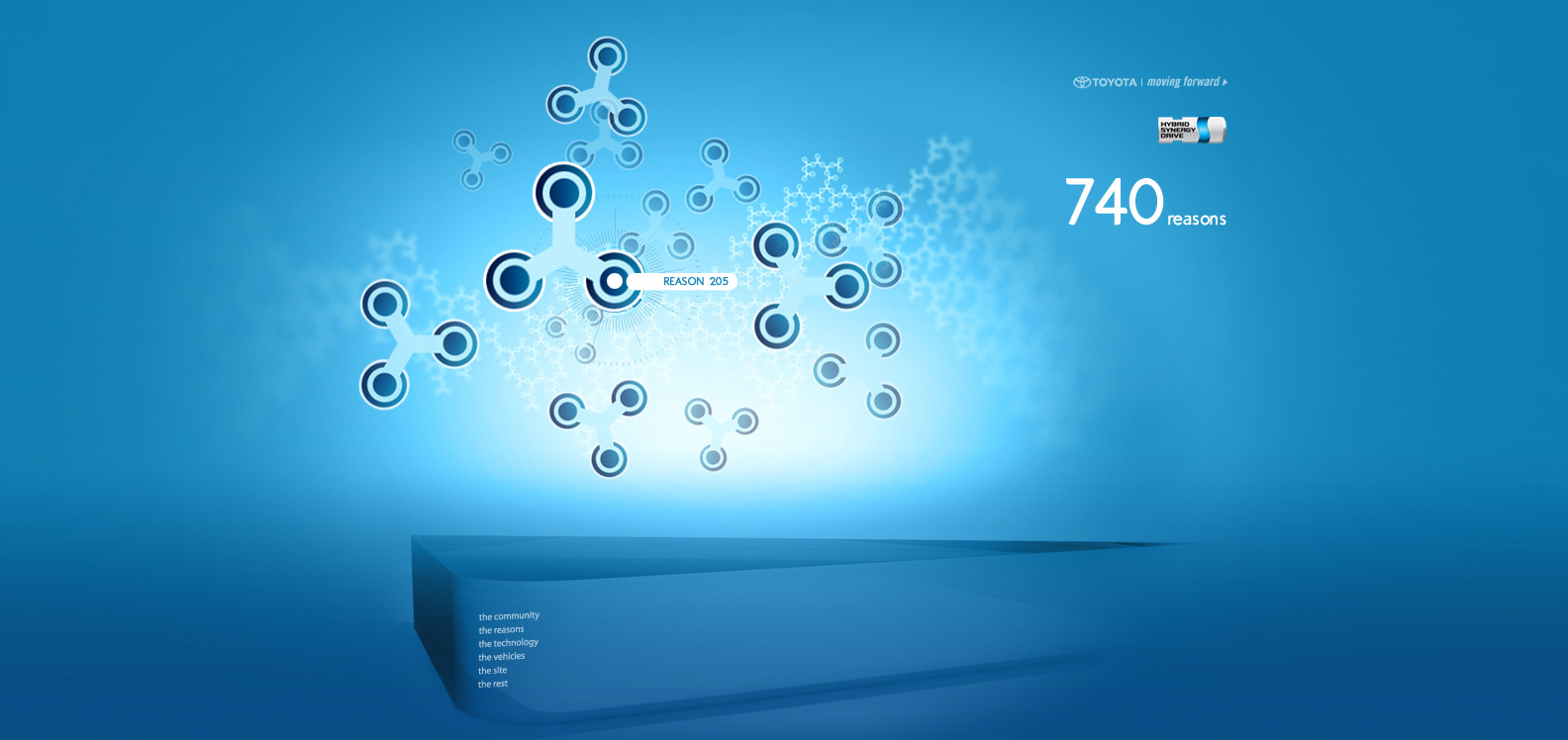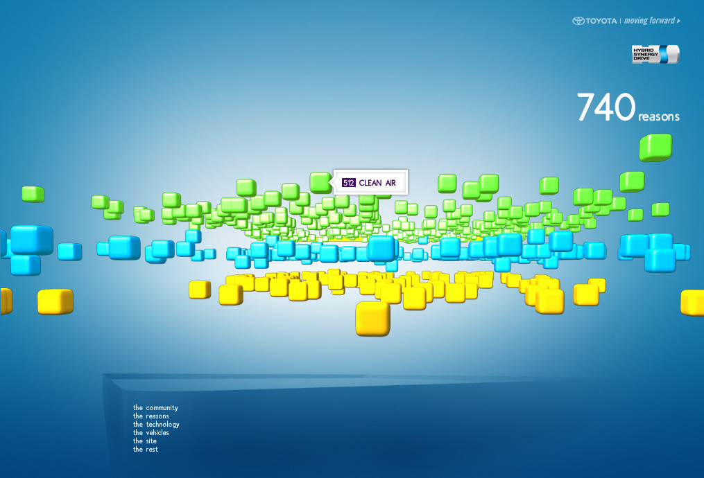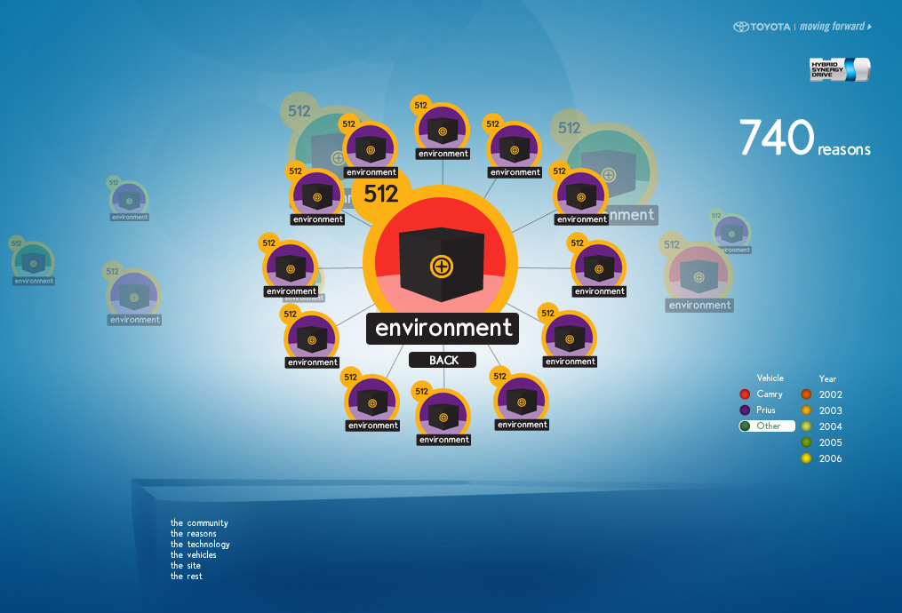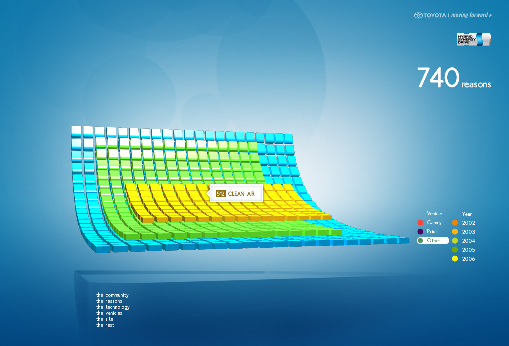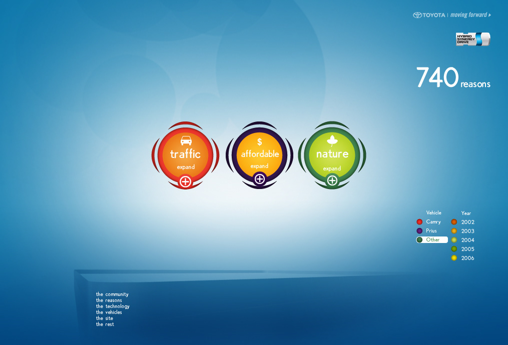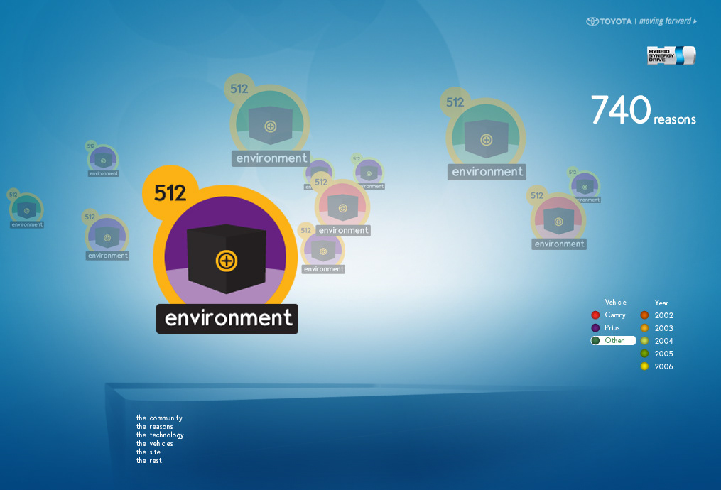 The Toyota.com/hsd 2006 flash microsite for HSD. My Reasons. Design / Art Direction and flash production.